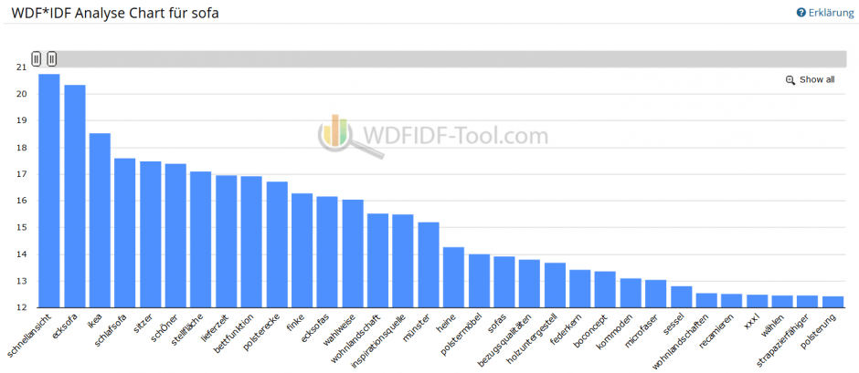 Grundsätzlich ist es also sinnvoll, die Erwartung in Bezug auf diese „Proof/Relevant Terms“ zu erfüllen. Wer einen sachlich fundierten Text schreibt, wird das zum Glück in der Regel von selbst machen. Viele Autoren nutzen aber WDF*IDF-Tools, um die verwandten Suchbegriffe zu ermitteln und in den Text einzubauen. Ein solches Tool liefert eine Auswertung wie in Abbildung 2 von WDFIDF-Tool.com. Dort sind Suchbegriffe zu finden, die in Bezug auf die Suchanfrage „sofa“ wichtig sein könnten. In jedem Fall sollte man all dies sehr kritisch prüfen (und keinesfalls Wörter wie „ikea“ oder „heine“ einsetzen). Denn: Die Tools nutzen nur eine sehr kleine Datenbasis, sodass sich oftmals Wörter zu Unrecht in der Liste befinden.
