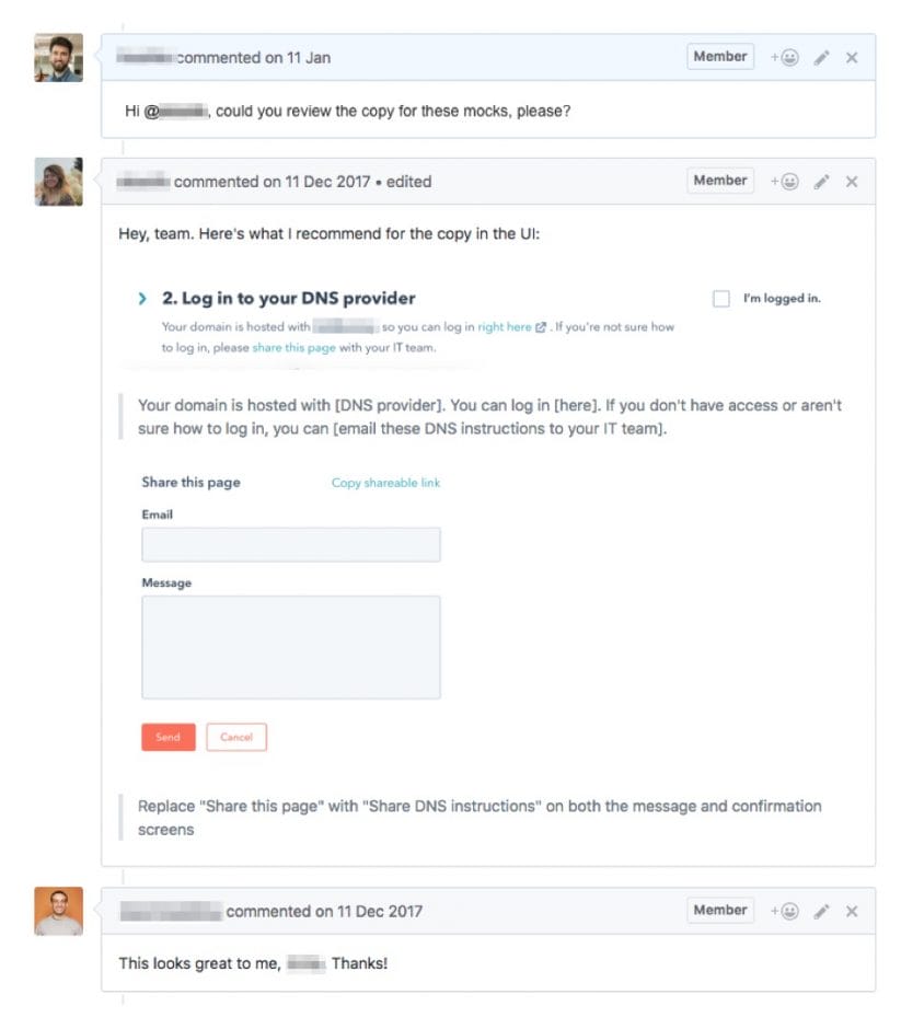 Kein Textprojekt ist zu groß oder zu klein, um uns einzubeziehen. Und die Anfragen kommen über die verschiedensten Kanäle: via Slack, über GitHub, durch ein gemeinsames Textdokument mit den Produktteams, per IM oder in einem direkten Gespräch. Dabei kann es sich um alles Mögliche handeln: von einem Label innerhalb eines Produkts bis hin zu einer simplen Checkbox, die Nutzer aus irgendeinem Grund verwirrt. Geht es um die Neugestaltung einer bestehenden Funktion, arbeiten wir am besten mit dem Designer zusammen, indem wir unsere Kommentare und Empfehlungen direkt in die Invision-Ansicht eingeben. Unser Anspruch ist es, alle Anfragen zeitnah zu bearbeiten und deshalb bemühen wir uns, den Überblick über alle offenen, in Bearbeitung befindlichen und abgeschlossenen Anfragen zu behalten.