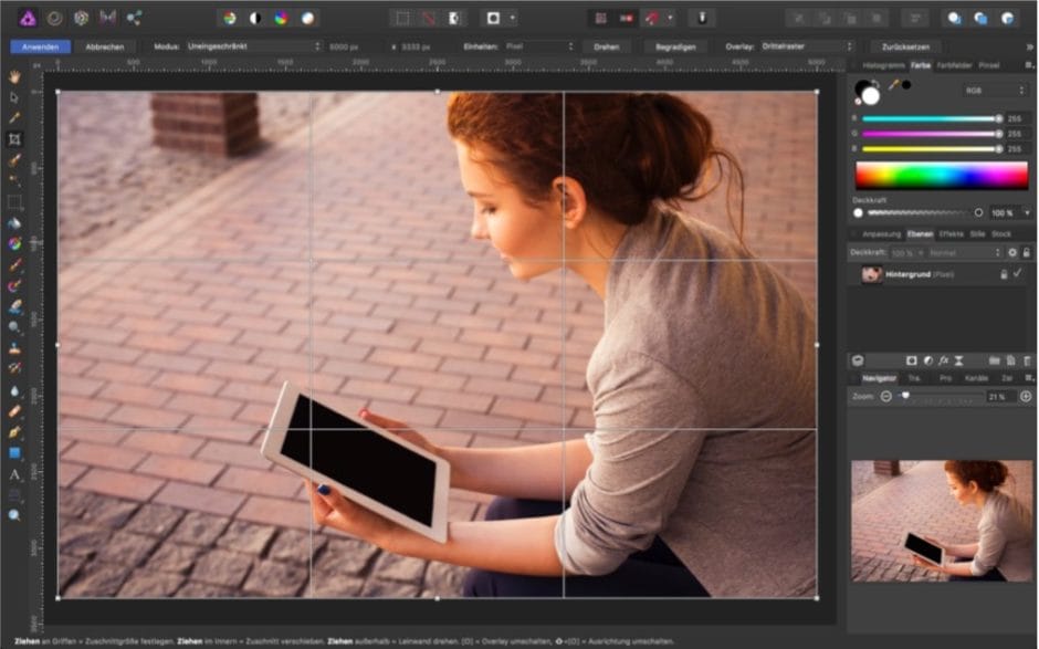 Wenn Sie sich schon einmal mit Fotografie beschäftigt haben, ist die Drittelregel Ihnen bestimmt über den Weg gelaufen. Dabei teilen Sie ein Bild vertikal sowie horizontal in Drittel und positionieren die wichtigen Bildelemente jeweils auf diesen Drittellinien. Die Drittelregel ist eng verwandt mit dem vorhin erwähnten Phi-Raster auf Basis des Goldenen Schnitts, allerdings etwas einfacher anzuwenden.