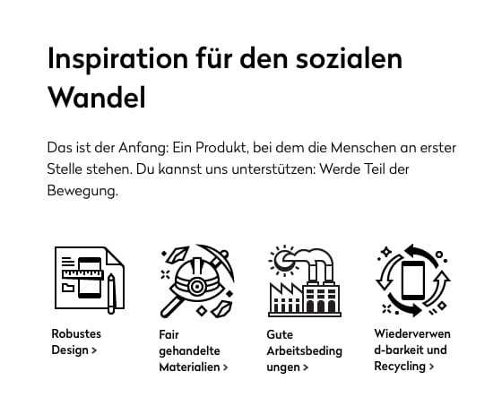 Fairphone wirbt unter anderem damit, dass die Materialien, die für das Smartphone verwendet werden, nachhaltig abgebaut werden und Arbeiter eine faire Entlohnung erhalten. Das Unternehmen schafft es, seine Produkte emotional zu vermarkten, indem es unter anderem über die Hintergründe der Materialwertschöpfung berichtet.