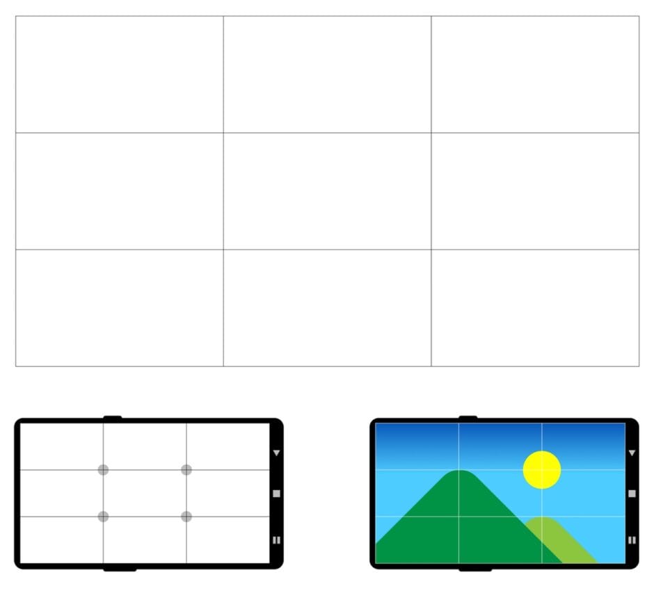 Um das perfekte Foto zu erhalten, ist es wichtig, aus einem geeigneten Winkel aufzunehmen. Die Rasterlinien sind hierbei hilfreich für die Komposition des Fotos, besonders wenn es um die „Drittelregel“ geht: Das Bild wird dabei gedanklich in horizontale und vertikale Drittel aufgeteilt. Eine allgemeine Empfehlung ist es, wichtige Objekte dort zu platzieren, wo sich diese Drittel-Linien treffen.