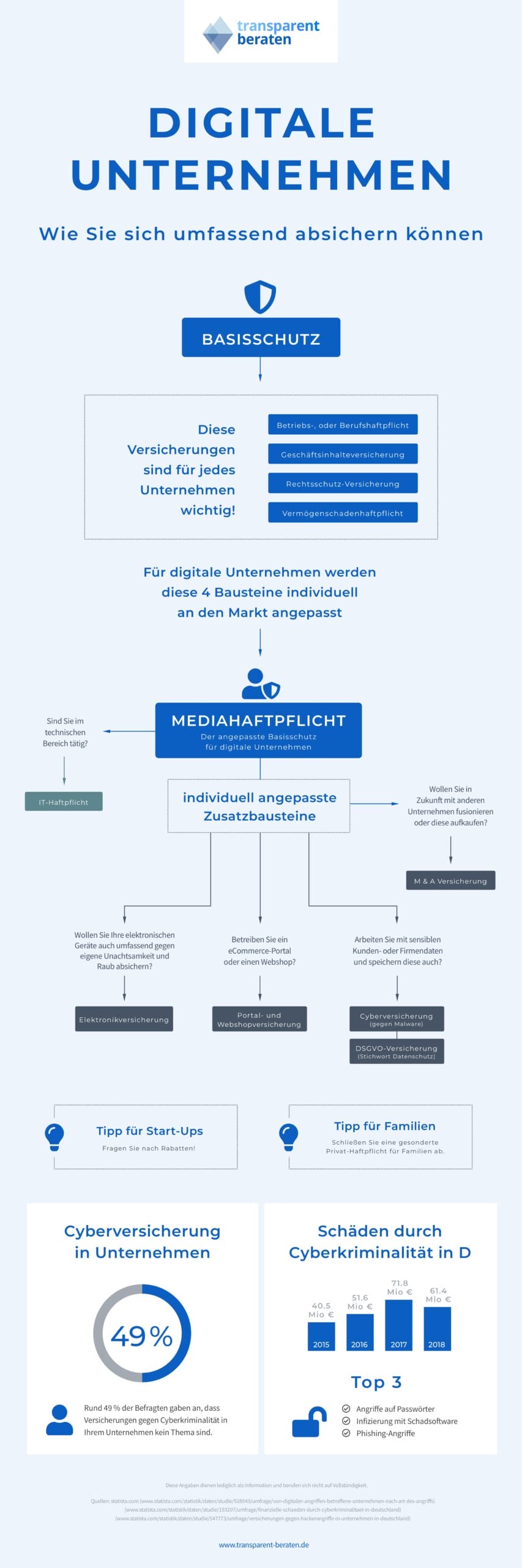 Für Onlineshops gibt es eigene Versicherungen, die dazu dienen, Sie gegen die spezifischen Risiken digitaler Berufsfelder abzusichern. Welche das sind und wann der Abschluss empfehlenswert ist, erläutern wir gleich nach der Infografik. Diese soll Ihnen als kurze Übersicht zu maßgeschneiderten Versicherungen im Digital-Bereich dienen.